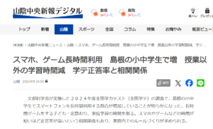 2024年8月8日付の山陰中央新報における「スマホ、ゲーム長時間利用 島根の小中学生で増」 の記事に弊社心理師のコメントが掲載されました! ぜひご覧ください! ■記事URL https://www.sanin-chuo.co.jp/articles/-/624497